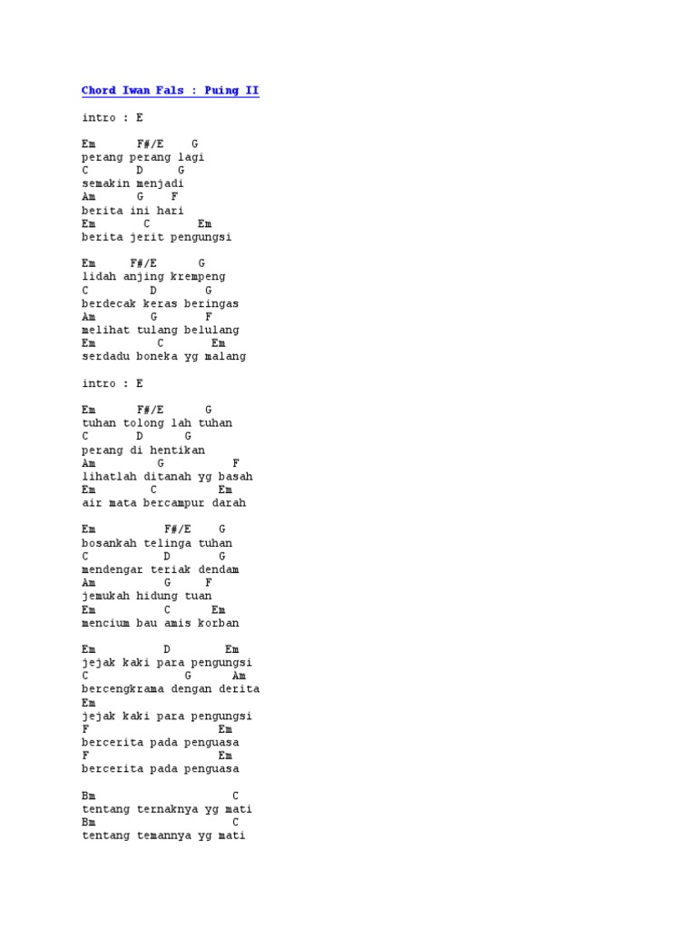 Chord Iwan Fals Puing II Intro E Em FE G perang perang lagi C D G semakin menjadi Am G F berita ini hari Em C Em berita jerit pengungsi Em FE G lidah anjing krempeng C D G berdecak keras beringas Am G F melihat tulang belulang Em C Em serdadu boneka yg malang. C Bawa lariku Am Em dalam dekapanmu.